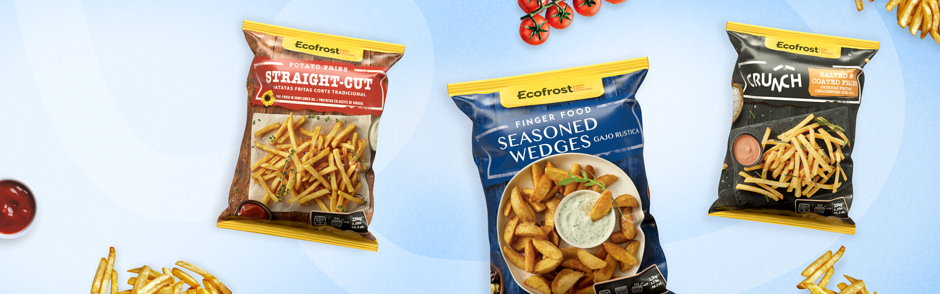 картофель фри различных нарезок, дольки, крокеты, пюре, «нуазет», луковые кольца, сырные палочки и ультра-хрустящие решения для доставки.